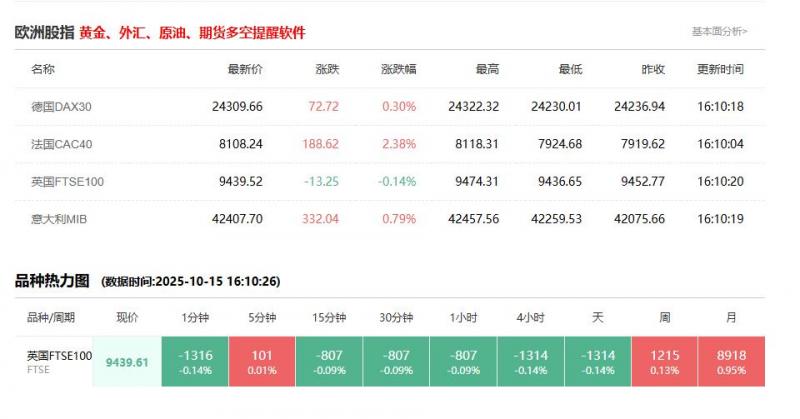 英国富时100指数10月16日(周四)开盘下跌1.25点,跌幅0.01%,报9423.50点;