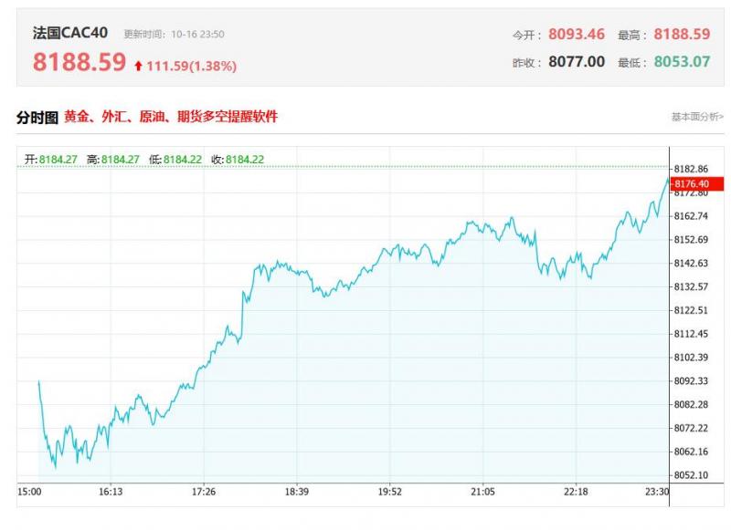 法国CAC40指数10月16日(周四)开盘上涨11.45点,涨幅0.14%,报8088.45点;