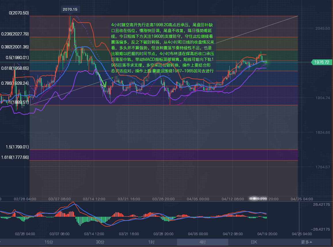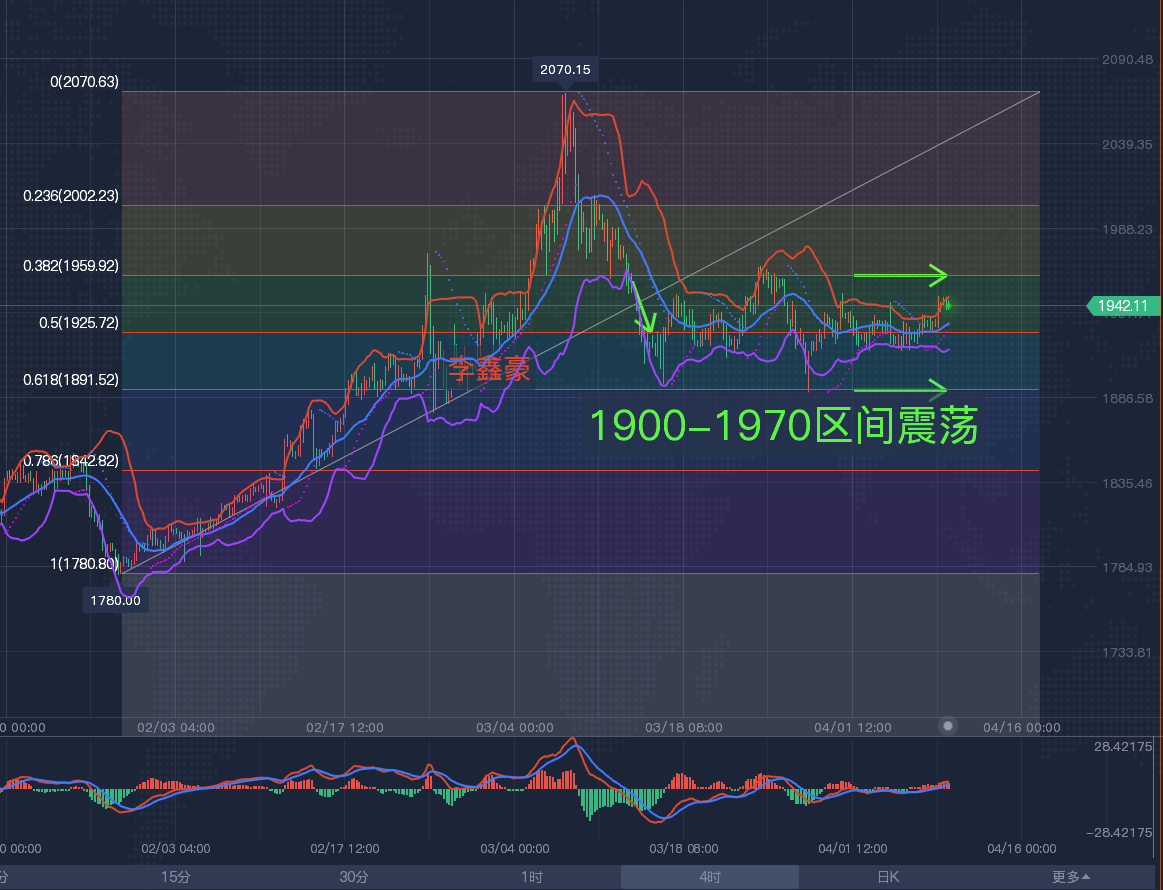 【黄金分析-美黄金】 黄金技术面分析:日线级别来看,上周先持续震荡,围绕在均线带上下运行,但并未突破20日线,导致震荡的主因是多空双方争夺造成的,而造成多空争夺的主因在于基本面多空的僵持,即市场对美联储加息预期对黄金带来阻力,而俄乌局势的不稳定又有一定的避险买盘需求,但双方又均没有明