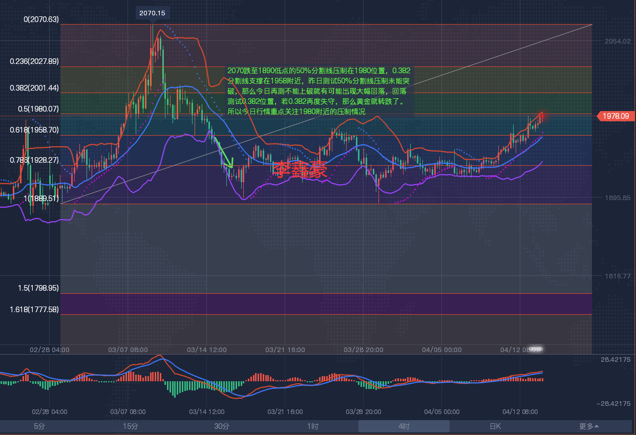 周二(4月19日)欧市早盘,现货黄金短线一波快速拉升,金价刚刚触及1980美元/盎司。知名财经网站FXtrt分析师Dhwaihta周二最新撰文,对金价技术前景进行分析。hta指出,假如金价突破阻力1990美元/盎司并收于该位上方,这对黄金多头来说是个警告信号。 现货黄金周一盘中曾触及1998.30美元/盎司高点