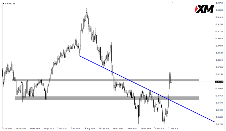 透过图表所示 去年7月即9月低点所延伸的趋势线 在今年1月初成功做出止涨 后续行情也沿着趋势线进行下跌 一直到2月底一波大量上涨直接做出突破 到了昨天行情下跌再次突破支撑位置 才又回到了下跌范围内 请各位注意到0.8664~0.8678区间 同时也是19年上半年度的盘整区间顶部 其次在