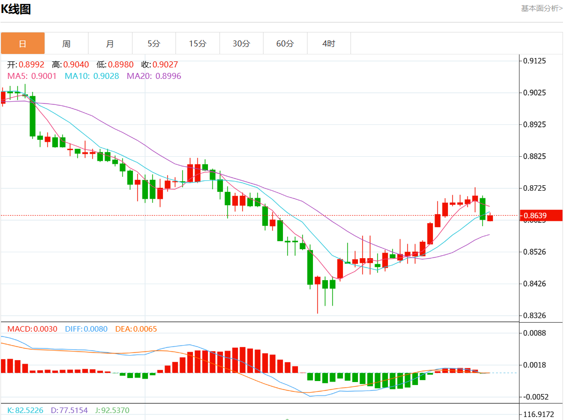 周四盘中,美元/瑞元报0.8641,涨幅0.16%。 今日分析:在0.8620上方做多头,目标在0.8670和0.8690。 技术点评:RI显示上行势头。 支撑位:0.87100.86900.8670 阻力位:0.86200.86050.8590 (亚汇网编辑:静香