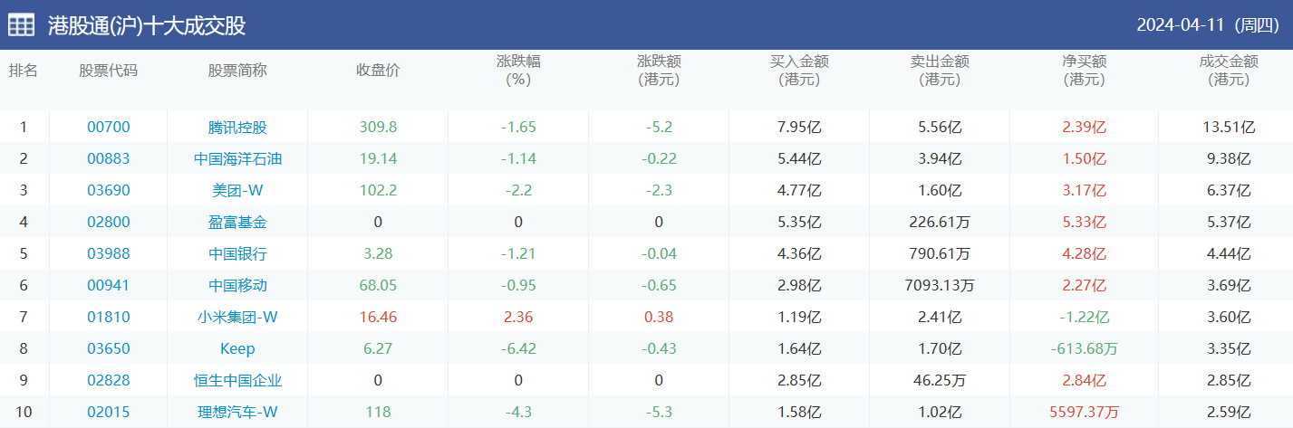 亚汇网4月12日港股通数据统计显示:中国海洋石油净买入额居首,达4.55亿港元,腾讯控股净卖出额居第一位。 (亚汇网编辑:静香)