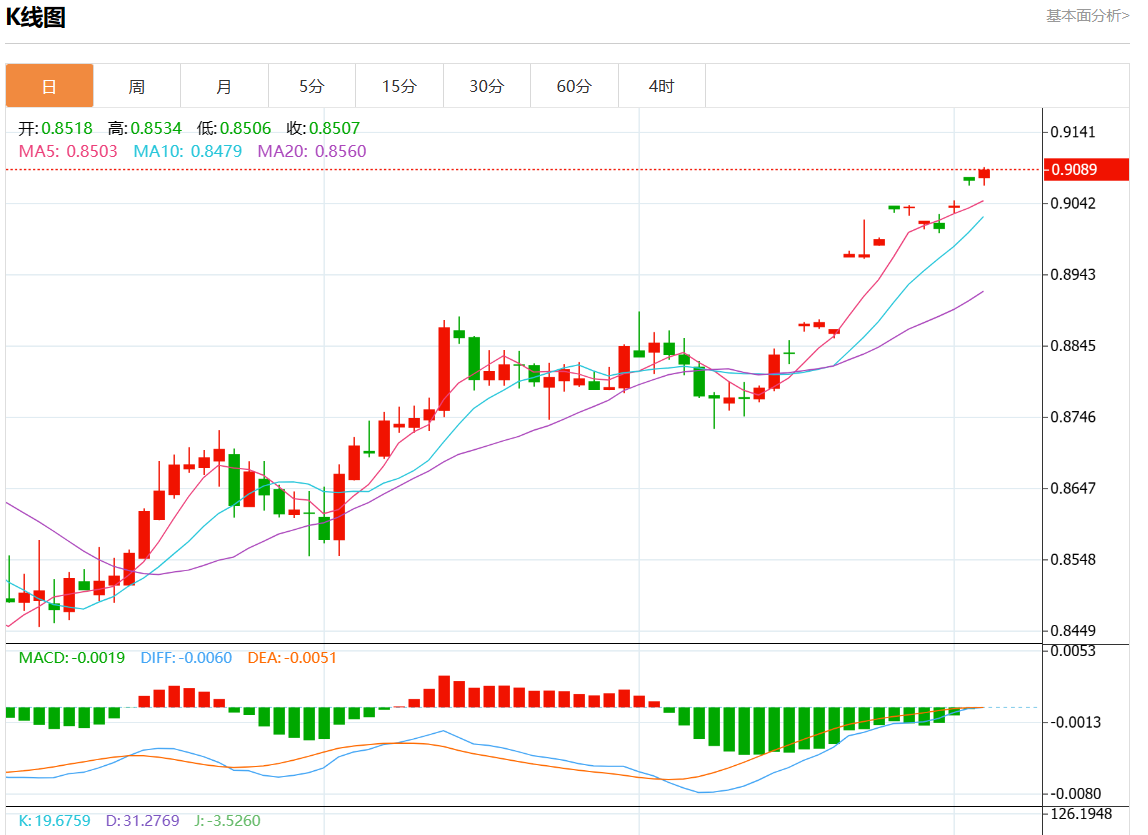 周三盘中,美元/瑞元报0.9090,涨幅0.12%。 今日分析:在0.8720之上,看涨,目标价位为0.9105,然后为0.9240。 技术点评:RI技术指标向上运行。 支撑位:0.94400.92400.9105 阻力位:0.87200.85500.8450 (亚汇网编辑:静香)