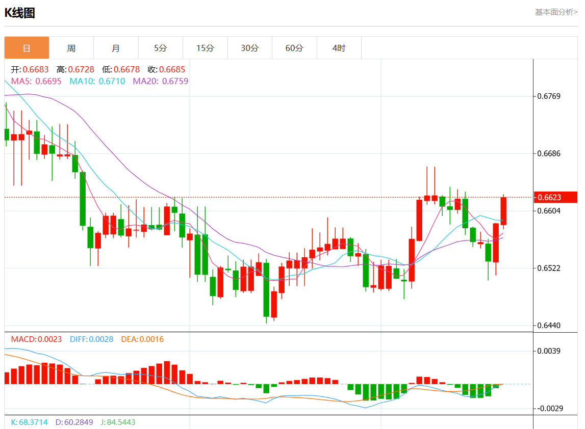 周四盘中,澳元/美元报0.6624,涨幅0.58%。 今日分析:在0.6585之上,看涨,目标价位为0.6650,然后为0.6670。 技术点评:RI技术指标向上运行。 支撑位:0.66900.66700.6650 阻力位:0.65850.65650.6545 (亚汇网编辑:静香)