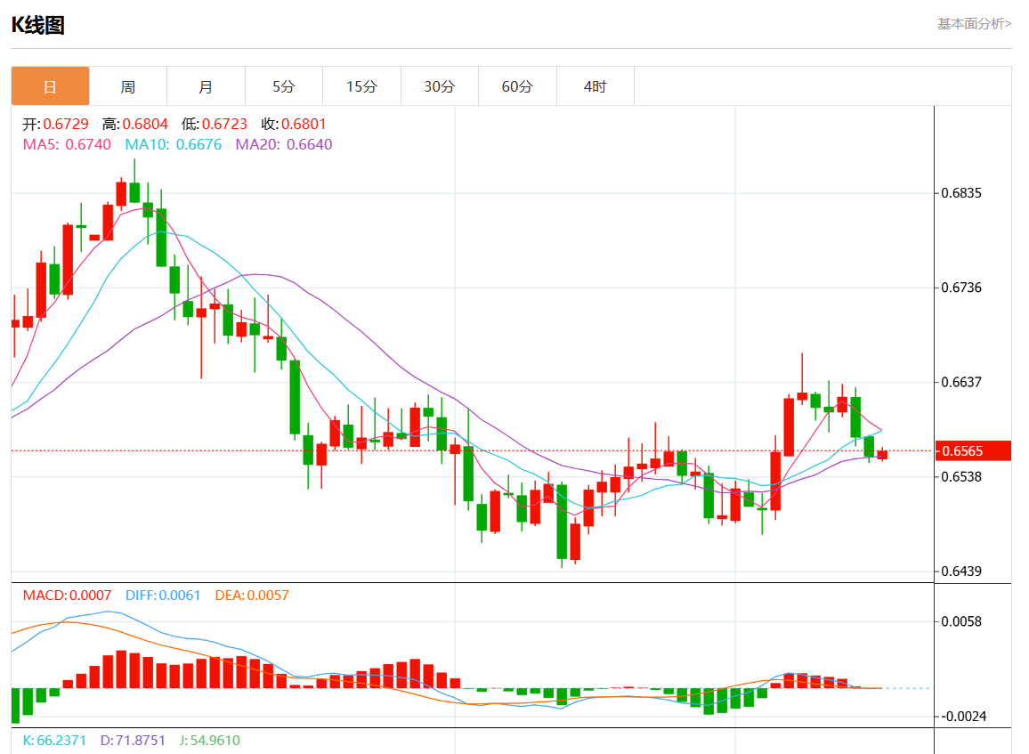 周一盘中,澳元/美元报0.6565,涨幅0.08%。 今日分析:在0.6575之下,看跌,目标价位为0.6545,然后为0.6530。 技术点评:上升的空间可能被0.6575阻力位所限制。 支撑位:0.66100.65900.6575 阻力位:0.65450.65300.6510 (亚汇网编辑:静香)