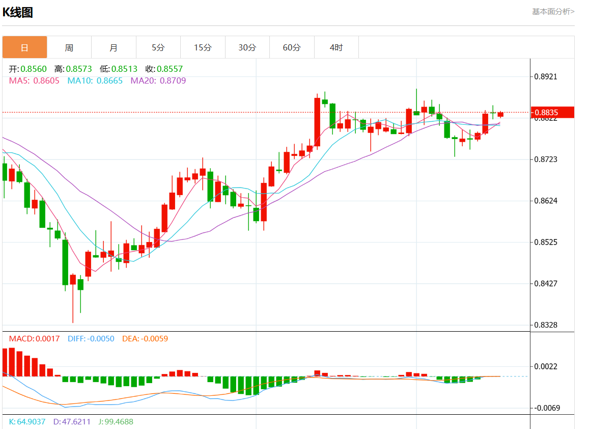 周一盘中,美元/瑞元报0.8835,涨幅0.01%。 今日分析:在0.8820之上,看涨,目标价位为0.8850,然后为0.8865。 技术点评:RI技术指标向上运行。 支撑位:0.88800.88650.8850 阻力位:0.88200.88000.8785 (亚汇网编辑:静香)