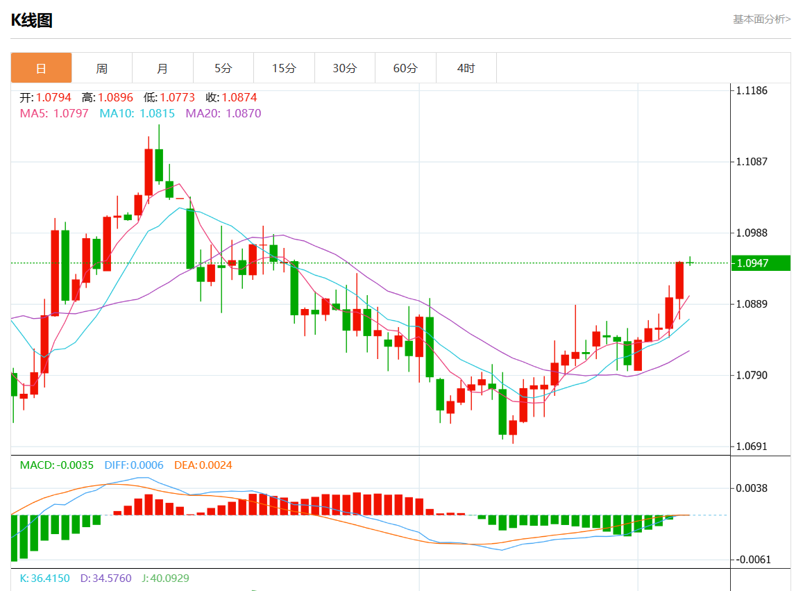 周五欧市盘中,欧元/美元最新报1.0946,日图跌0.02%. 今日分析:在1.0915之上,看涨,目标价位为1.0970,然后为1.0990。 技术点评:在1.0915之上,为多头信号,向上的目标位为1.0970。 支撑位:1.10101.09901.0970 阻力位:1.09151.08951.0870 (