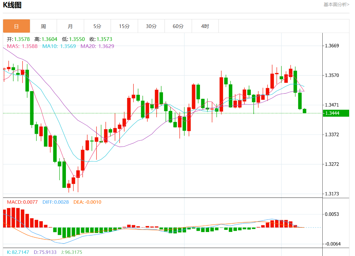 周五盘中,美元/加元报1.3444,跌幅0.10%。 今日分析:在1.3480之下,看跌,目标价位为1.3425,然后为1.3400。 技术点评:只要依旧存在1.3480阻力位,价格波动存在看跌的趋势。 支撑位:1.35251.35051.3480 阻力位:1.34251.34001.3390 (亚汇网编