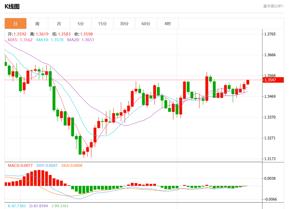周三盘中,美元/加元报1.3547,涨幅0.15%。 今日分析:在1.3515之上,看涨,目标价位为1.3570,然后为1.3585。 技术点评:RI技术指标看涨,有进一步向上趋势。 支撑位:1.36001.35851.3570 阻力位:1.35151.34951.3480 (亚汇网编辑:静香)