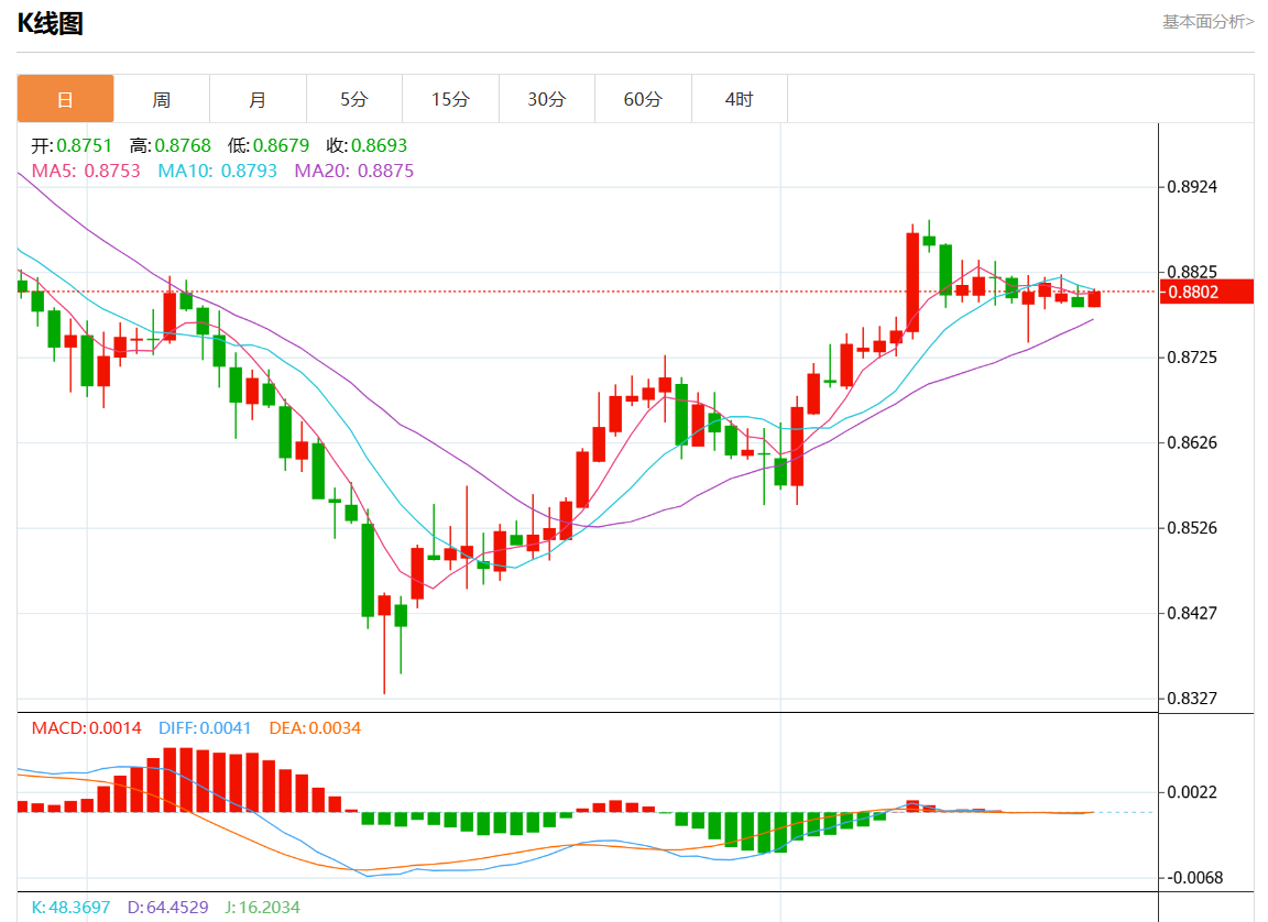 周三盘中,美元/瑞元报0.8802,涨幅0.20%。 今日分析:在0.8780之上,看涨,目标价位为0.8820,然后为0.8835。 技术点评:RI技术指标向上运行。 支撑位:0.88450.88350.8820 阻力位:0.87800.87650.8755 (亚汇网编辑:静香)