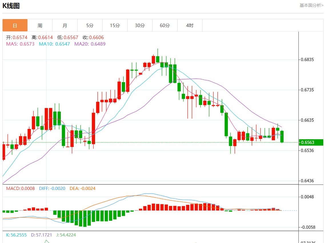 周三盘中,澳元/美元报0.6563,跌幅0.59%。 今日分析:在0.6590下方做空,目标在0.6545和0.6530。 技术点评:RI显示下行势头。 支撑位:0.66150.66050.6590 阻力位:0.65450.65300.6510 (亚汇网编辑:静香)