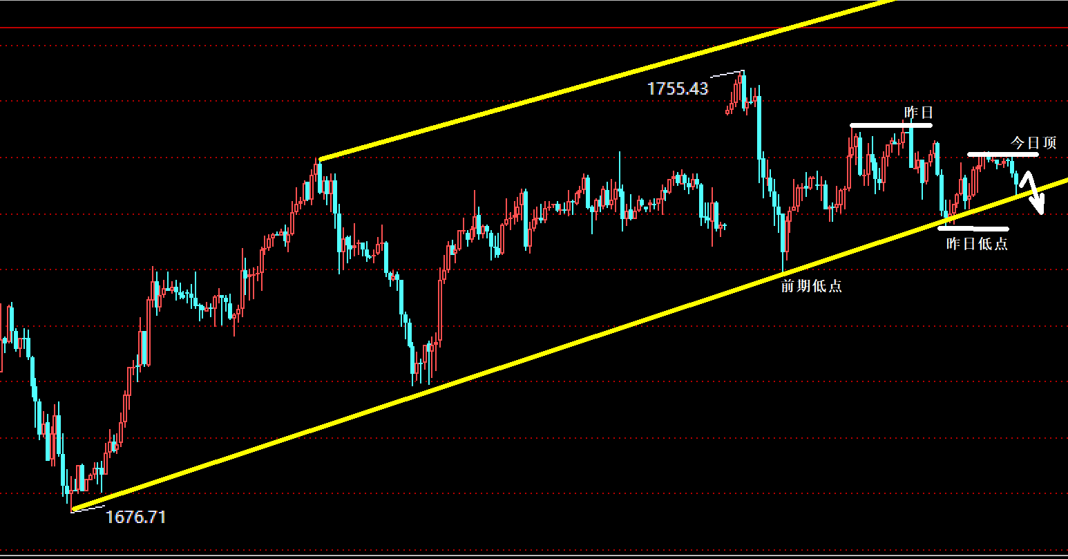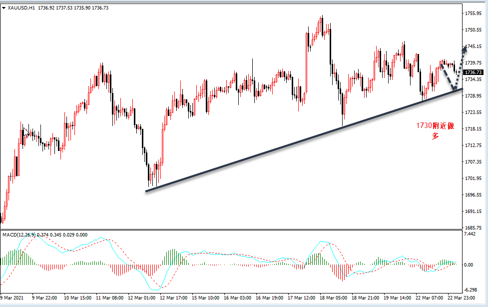 昨日鲍威尔表示复苏快于预期,经济增长势头将要增强,拜登总统将要推出3万亿美元的基建计划,旨在提振美国经济,并且声明美联储仍会提供支持,受这些消息面的影响,昨日美元的走势上冲无力,技术面走势依然还是维持震荡 目前黄金技术面短期的走势依然还是一个偏向小幅度的多头反弹上涨走势,目前技术面短期黄金维持在