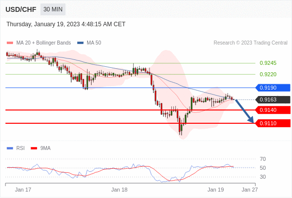 周四(1月19日)盘中,美元/瑞郎暂报0.9163,涨0.0012,涨幅0.13%。 美元/瑞郎汇率今日分析:在0.9190之下,看跌,目标价位为0.9140,然后为0.9110。在0.9190上,看涨,目标价位定在0.9220,然后为0.9245。 技术点评:只要依旧存在0.9190阻力位,价格波动存在看跌的趋势。