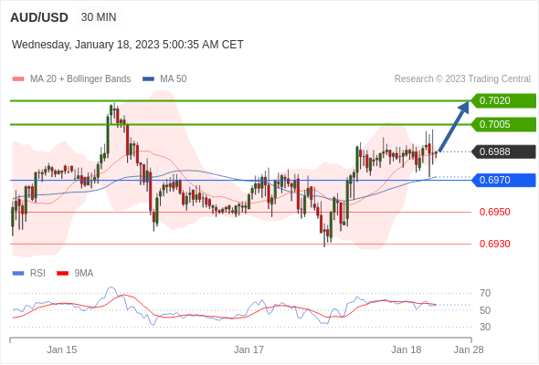 周三(1月18日)盘中,澳元/美元暂报0.6988,涨0.0001,涨幅0.01%。 澳元/美元汇率今日分析:在0.6970之上,看涨,目标价位为0.7005,然后为0.7020。在0.6970下,看空,目标价位定在0.6950,然后为0.6930。 技术点评:RI技术指标呈现继续上升趋势。 阻力位: