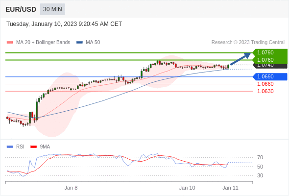 周二(1月10日)亚盘,欧元/美元最新价报1.0732,开盘价为1.0731。摩根士丹利预计,受持续的能源危机和紧缩的货币政策影响,2023年欧元区经济将收缩0.2%,该地区通胀率在2022年10月曾飙升至前所未有的10.7%的新高。 欧元/美元汇率今日分析:在1.0690之上,看涨,目标价位为1.0760,然后为1.07