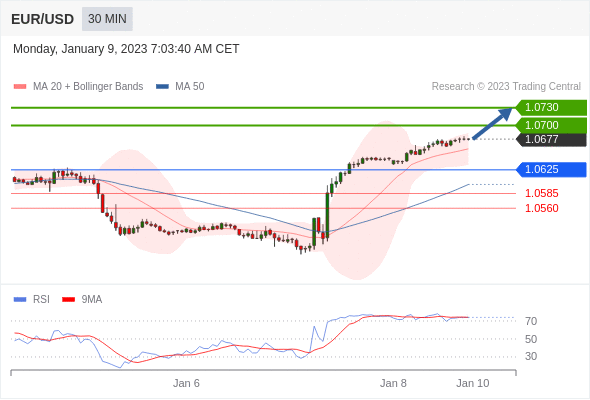 周一(1月9日)亚盘,英镑/美元最新价报1.2108,开盘价为1.2085。受能源价格上涨、通胀水平高涨影响,英国多个行业陆续举行罢工,导致英国铁路运输只有约五分之一车次仍能正常运行,约一半铁路服务网络中断。 欧元兑美元汇率分析 在1.0625之上,看涨,目标价位为1.0700,然后为1.0730。在1