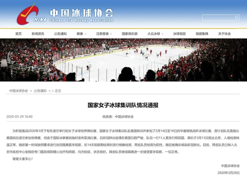 3月29日,中国冰球协会发布情况通报,两名女子冰球集训队队员确诊为新冠肺炎。中国冰球协会称两名队员均为轻症,目前状态良好。 中国冰球协会在通报中称,为备战今年3月下旬在波兰进行的女子冰球世锦赛,国家女子冰球集训队赴美国转训并参加了2月14日至18日的华盛顿挑战杯冰球比赛。 按原计划