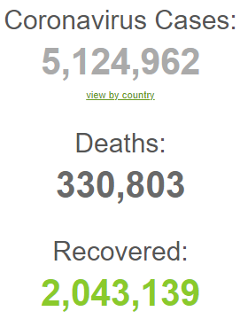 据Worldotr实时统计数据显示,截至北京时间5月21日22时21分(加西时间5月21日07时21分),全球新冠病毒确诊病例达逾512万例,为5124962例,死亡病例超过33万例,为330803例。 其中近三分之一的确诊病例发生在美国,美国新冠病毒确诊病例达逾159万例,为1596526例,死亡病例增至逾9.5万例,为95021