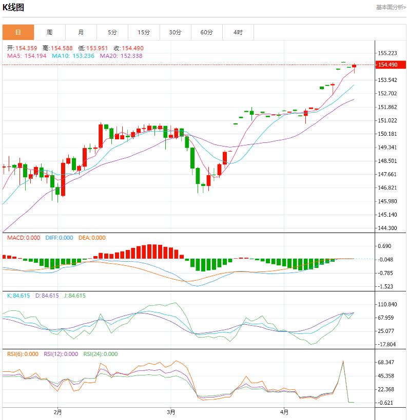 周五美市盘中,美元兑日元上升至-0.124,增幅-0.08%。日本将会进行干预以阻止日元兑美元进一步贬值至155。 货币对:美元/日元 行情分析:汇价高见154.669,低见153.585。上一交易日,汇价收于154.706。基本面上看,日本央行董事会成员指出,日本央行维持超宽松货币政策、寻求劳动力供需平衡至关重要。日