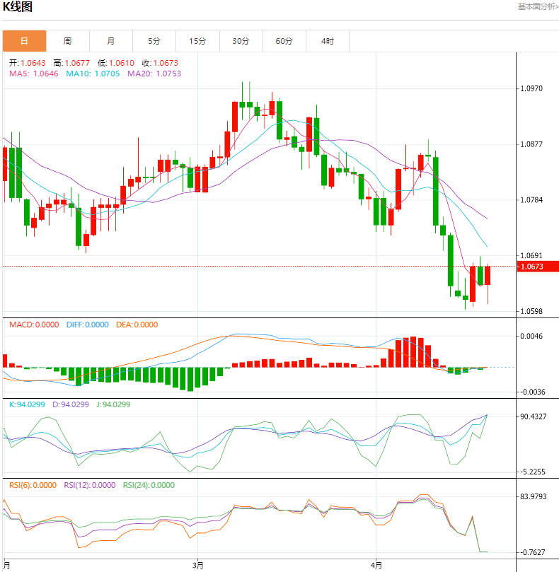 欧元跌后回升 欧元早些时候一度下跌多达0.30%,但随后回升并走高。北美时段,欧元/美元报1.0666,上涨0.21%。欧元仍然受到美元走强的压力。上周,欧元/美元下跌1.8%,本周最低跌至1.0601,为11月初以来的最低水平。 今天没有美国数据公布,欧元区也只有一项数据。德国3月份I同比下降2.9%,连续第九个月
