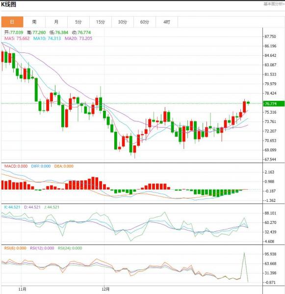 油价不再是困于窄幅波动区间,而是接下来油价能涨多高的问题。油价最终选择发力上攻,其中非常关键的变化是供需层面预期好转。 今日原油价格技术分析: 上一个交易日(1月26日),油价先跌后涨,到了晚间再次突破创新高。从上周周线看,油价收于中轨,形态看还要上涨,本周上方关注80的突破