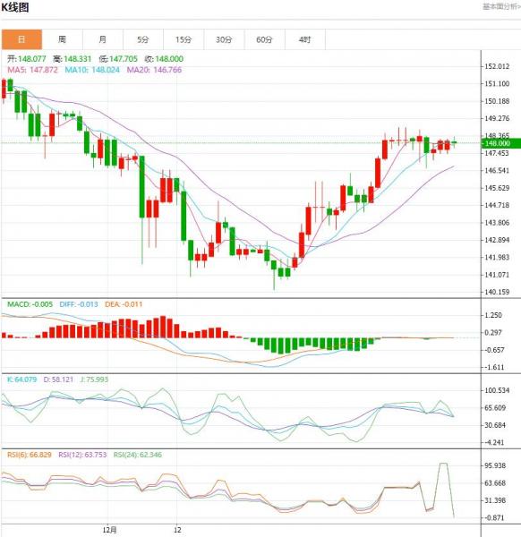 周一盘中,日元/美元下跌至-0.108点位,跌幅-0.07%。预计到今年年底,日元兑美元将升值至140,比目前的水平上升5%,但低于普遍预期的135。 货币对:日元/美元 行情分析:汇价高见148.331,低见147.705。上一交易日,基本面上看,日本央行12月货币政策会议纪要显示,政策制定者在上个月积极讨论了逐步取消