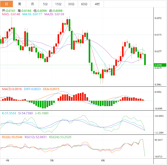周三盘中,纽元兑美元下跌至0.6099,跌幅1.04%。 基本面上,纽元/美元在欧市早盘录得两周新低0.6113。由于需求黯淡且出口疲弱,中国经济前景恶化,预计该货币对进一步下跌。中国国家统计局报告称,由于家庭需求疲软,5月份企业利润下降了12.6%,高于4月份18.2%的下跌。值得注意的是,新西兰是中国的主要贸易伙伴之一