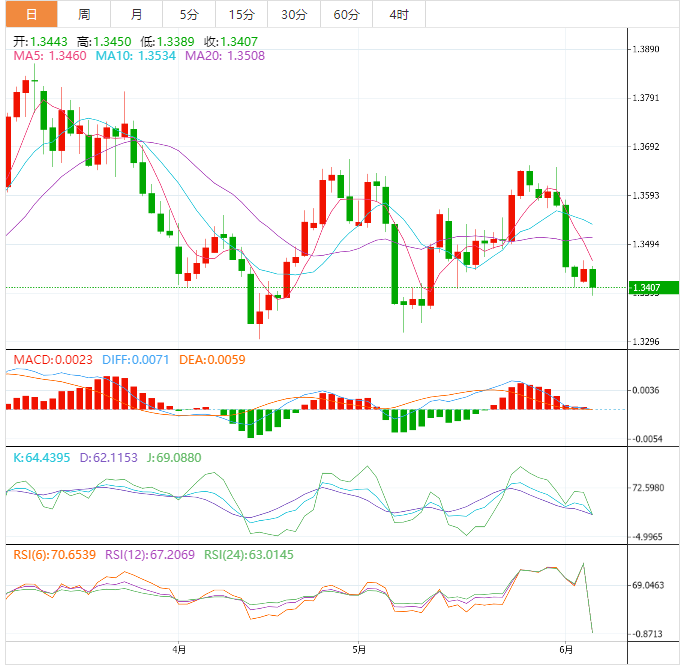 周二盘中,美元兑加元下跌至1.3410,跌幅0.26%。 加元基本面:美元/加元逆转了本周开始的反弹,同时在进入周二欧洲时段时刷新了1.3410附近的日内低点。该货币对走势没有印证油价低迷,美元下跌以及市场情绪谨慎乐观打压该货币对。展望未来,在周三的加拿大央行货币政策会议和周五的加拿大5月就业报告之前,加拿大5月I