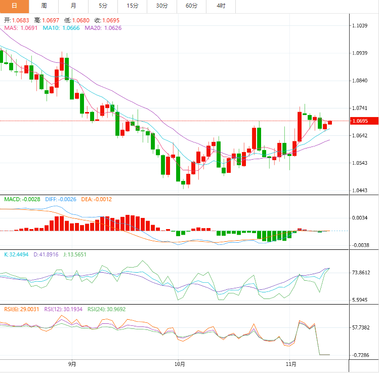 周一盘中,欧元兑美元在1.0700关口下方的狭窄交易区间内震荡。在欧元区第三季度国内生产总值(gd)公布之前,交易员倾向于观望。欧元区的季度增长率预计将收缩0.1%,而年度增长率预计将增长0.1%。疲软的报告可能会对欧元造成压力,并对该货币对造成不利影响。主要货币对目前在1.0685附近交易,当日保持不变。 从技术面