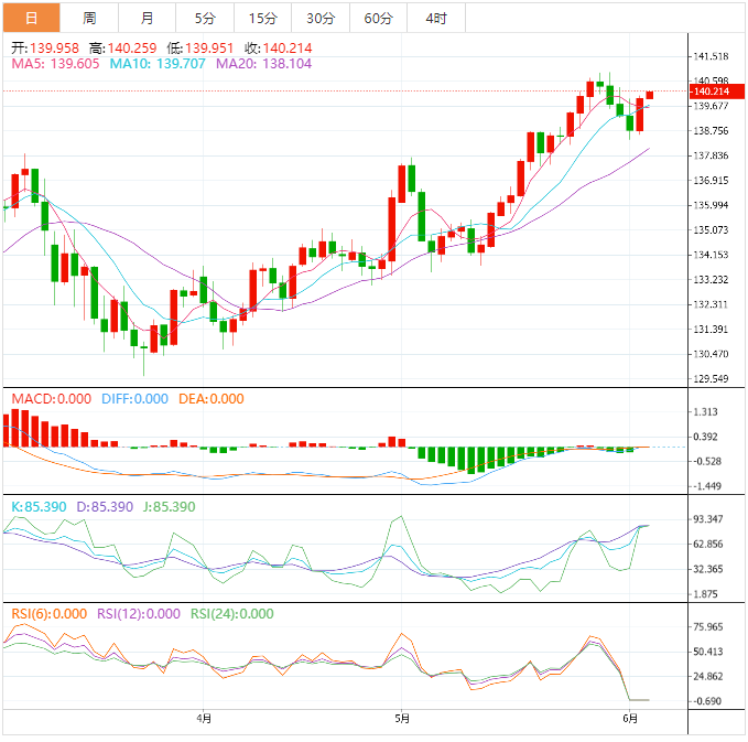 美元兑日元在140.20附近保持温和涨幅,因美国国债收益率上扬,以及美元走强推高了美元兑日元价格。避险情绪以及悲观的日本经济数据为日元的上行空间增添了力量。 尽管如此,日本5月Jiu银行服务业I从56.3降至55.9。相反,“综合I(综合制造业和服务业活动数据)以2013年10月以来最快的速度扩张。该指数从4月的52.9