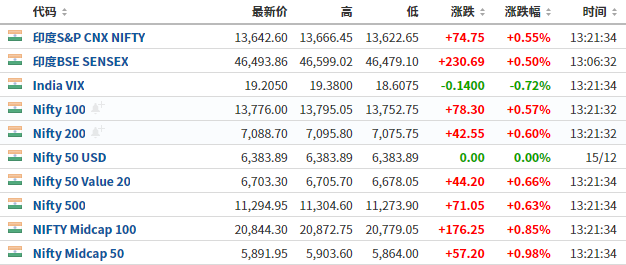 受益经济复苏提振,印度股市走高,基准股指创下新高。截至北京时间12:06,印度标准普尔x指数上涨0.7%,至46,577.84点,而ifty50指数涨幅相同。这两个指数都将连续第四个交易日上涨。 亚洲股市走高,因美国国会正推动一项提振经济的支出计划。凯投宏观(亚洲)有限公司报告写道,昨天的一份贸易报告表
