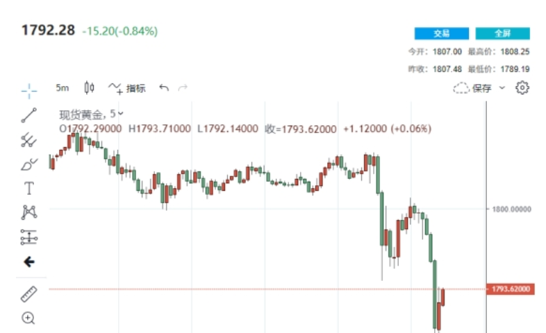 周二美股开盘之后,黄金突然迎来一波短线急跌行情,一度跌破1790,最低触及1789.19美元/盎司,日内最多跌近20美元。 有数据显示,COX最活跃黄金期货合约北京时间10月26日21:30一分钟内买卖盘面瞬间成交2488手,交易合约总价值4.46亿美元;21:32一分钟内买卖盘面瞬间成交2878手,交易合约总价值5.15亿美元。