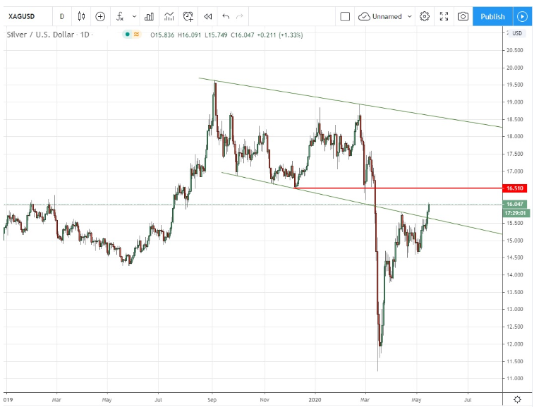 白银日图:突破前高,升势延续 日图上,银价隔夜进一步走高上破了4月14日高点,再次证实了自3月19日以来的升势仍在延续。大的格局上,银价自2月24日以来仍可能是V字形态,这意味着价格中短期内的上行目标仍可以指向18.90档高位。日图上还可以看到价格短期重要阻力位于16.50附近,即去年12月盘整低点。 近期黄金、白银