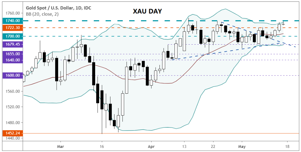 尽管美元走势坚挺,美元指数继续尝试上破短线阻力100.40,但是黄金可能不为所动延续升势。增长的需求可能为黄金的上升保驾护航,短期地缘政治风险上升以及美股走弱等可能增加对黄金的避险需求,而长期而言极度宽松的货币政策凸显黄金相对信用货币的价值。 日图显示,黄金昨日上行突破1722一线水平阻力,日内目前上行