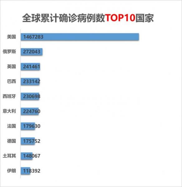 海外网报道,据美国约翰斯·霍普金斯大学发布的实时统计数据显示,截至北京时间5月17日6时30分左右,全球累计确诊新冠肺炎病例4621327例,累计死亡310869例。据巴西卫生部消息,当地时间16日,巴西新增14919例新冠肺炎确诊病例,累计确诊233142例,累计确诊病例数超过意大利和西班牙,位居全球第四。 据国家卫