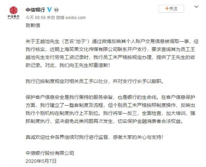 昨日,王越池(艺名“池子”)脱中秀演员,发布声明指责中信银行泄露其个人账户交易信息。王越池在该声明中指出,在他向此前供职的笑果文化提出和平解约未果的情况下,双方均提出了仲裁,笑果文化让其赔偿3000多万元。在笑果文化寄出的案件材料中,王越池发现,材料中有属于重要个人隐私的中信银行个人账户交易明细,并