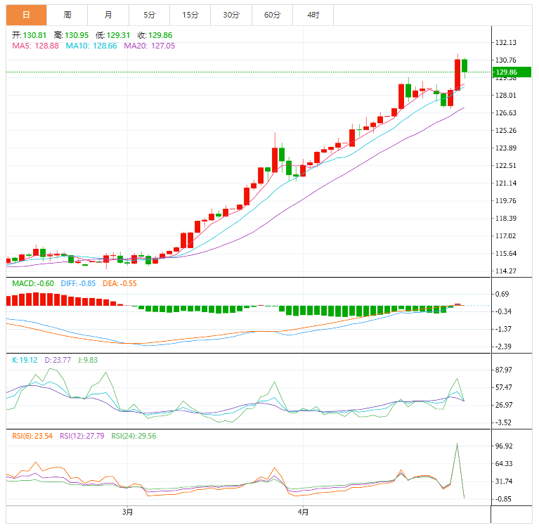 4月英镑兑美元行情,英镑兑美元从4月初的开盘价121.69,截至收盘价129.86。日元4月整体上涨817点,日元在4月28日上涨至月内高点131,25。 4月美元兑日元汇率走势分析 第一周美元/日元行情 第一周,日元大跌逾1%。除了美元走强带来的利空,日本央行似乎乐意看到弱势日元,对日元近期下跌会推高进口成本,进