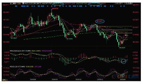 日线级别:震荡;MACD金叉,KDJ金叉,5日均线上穿10日均线金叉,汇价坚守在布林线中轨97.25上方,后市偏向多头,有望进一步涨向布林线上轨97.93附近,100日均线阻力也在该位置附近;进一步阻力在11月25日低点98.16附近,11月29日高点阻力在98.54附近。