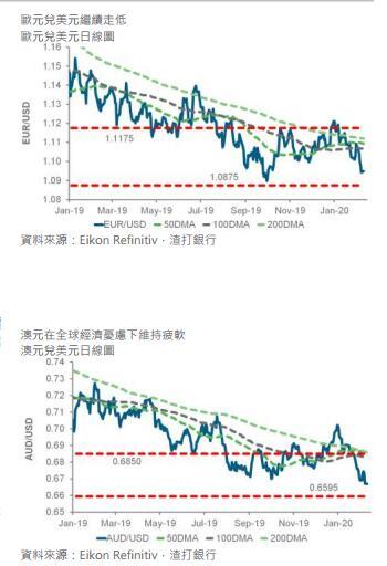 澳元及纽元继续在市场对冠状病毒疫情的忧虑下受压,大宗商品价格及全球债券收益率亦见下跌。若澳元汇价持续跌破0.6660 - 75的话,将可能进一步跌向0.6595。纽元兑美元亦下跌,失守0.6410 - 15(从十月低位0.6200计起的61.8%回调水平)。