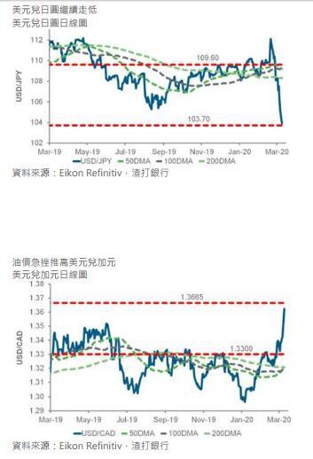 美国国债收益率大幅下跌收窄相对息差,拖累美元全线下跌。周末新闻受石油相关消息主导,虽然美国就业数据则相对强劲,但经济不确定性显著上升,增加了联储局在上周紧急减息50个基点后,今个月稍 后进一步减息的压力。未来几周外汇市场波动性可能会更高,美元兑 日圆跌穿数个关键支持位,并失守104.00。我们维持看淡汇价发展, 除非我们看到有关新型冠状病毒的消息出现显著改善。我们相信任何 的上升都可能是目前的修正反弹,即市支持位料于103.70。