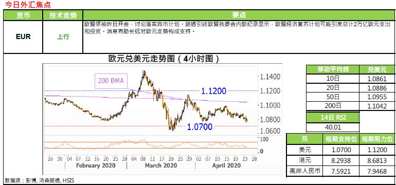 欧盟各国领袖于昨日视频峰会后,欧洲理事会主席米歇尔表示,欧盟领袖同意一项紧急支援基金(共同债) ,但未有公布实际数额。法国总统马克龙表示,欧盟领袖讨论过联合发债及以其他财政工具,支援最受疫情影响的地区或经济环节。惟各国最大分歧不在于共同债,而是发债后筹组成的支援基金,会以借贷抑或以补贴方式支援最有需要国家。市场消息透露,欧盟领袖要求欧委会下月6 日定出细节。欧盟峰会未能就共同债细节达成一致,使有关计划存在不确定性,惟见欧元汇价则变动不大,暂徘徊于1.0780 美元水平。