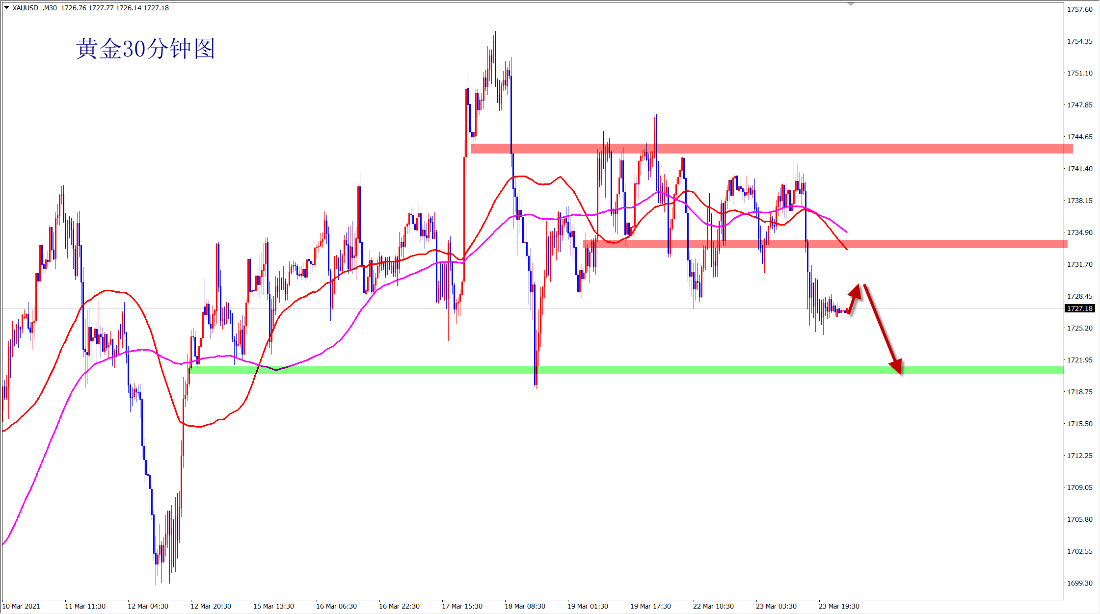 黄金1735下空,止损1740,目标1720-1715;