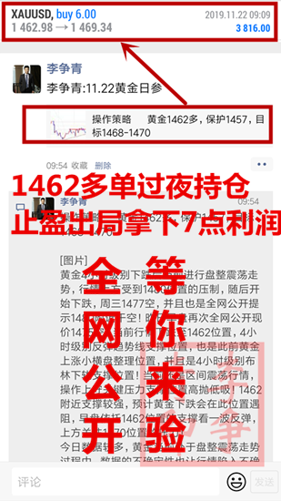 黄金市场说难不难说易却也不易,在这个瞬息万变的战场,不可能让所有人都赚钱而失去平衡,频频亏损的大有人在。争青每天公开策略,多单止盈拿下7点利润,实力是做出来的,欢迎做投资的朋友来验。争青现在提供3个体验名额,如果你操作上还是不太理想不妨咨询争青得到指导! 策略:黄金晚间现价1457附近做多,目标