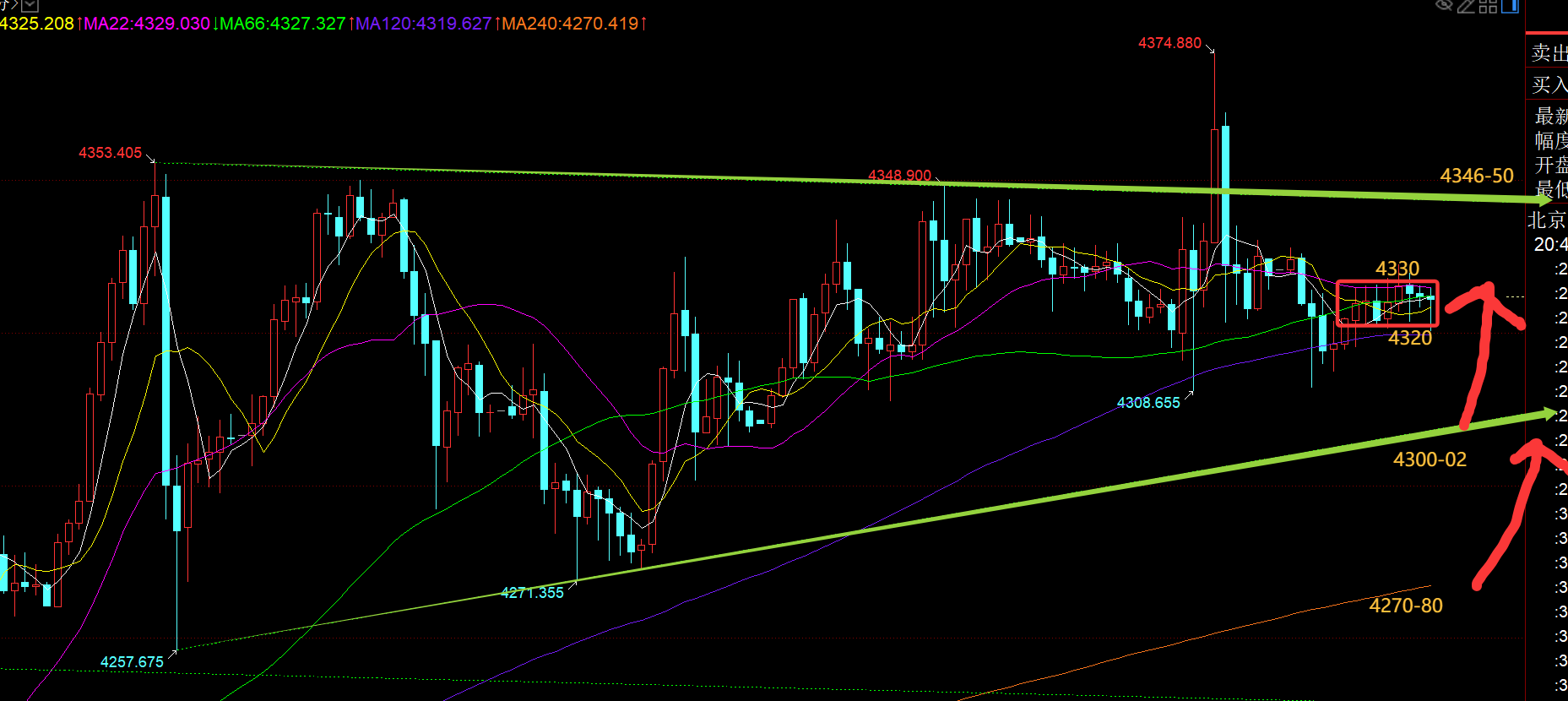第二,黄金4小时线级别:中轨位置仍顽固支撑着,今晚上移4320,关注它的得失;若失守它,那么会下调一波;持续稳住它,就仍会反复拉高;