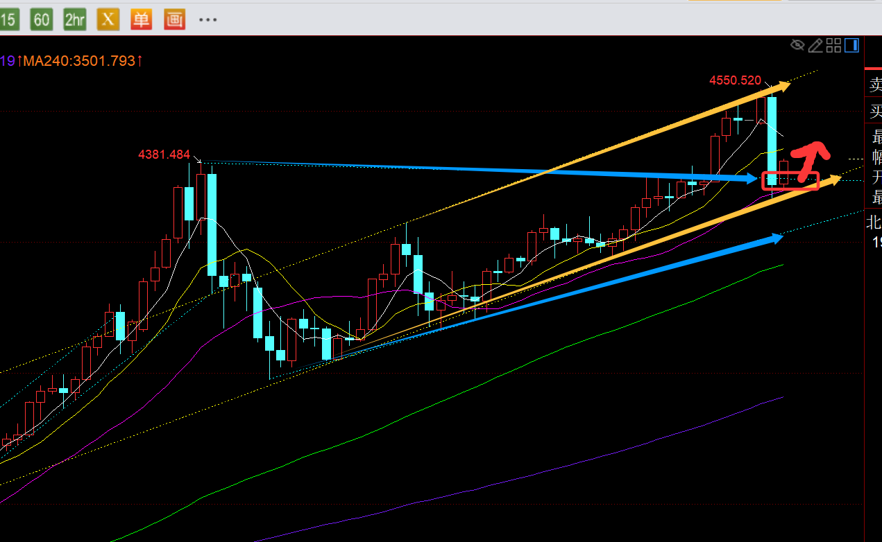第一,黄金日线级别:下午针对上图做了一次调查,这周的一波下跌砸盘会循环走10月份中旬那波,还是11月中旬那波,基本上两者对半,选择概率都差不多;以我个人的判断来讲,结合图中所示,前期两波走势形态上都比较雷同,走完abc之后展开某一个底部区间整理,然后最终上破区间的上轨再单边发力上攻,而上轨其实指的是就是10均线;另外,紫色线代表中轨,两次都是击穿中轨才走完abc调整,无非就是c的力度有大小;而本周这次形态上如出一辙,也击穿了中轨,目前就是走最后c浪,也就是今晚或后续几日会产生一个底部区间,届时把握住此区间的相对低位,就是后市再次单边上攻的起涨点;因此,还是那句话,珍惜今年打压给出的低位;那么参考位置有哪些呢? 第一,是4275,这是昨日研报提及的50%分割支撑点,第二,4264-4251-4245都是前期顶底转换支撑点;第三,日线前期收敛三角下轨支撑点,今日对应下去是4227左右;第四,周线10均线,以及618分割支撑,对应4208-4205,属于强支撑;所以,个人认为,短期内的底部低点就在这四个支撑的其中一个;而判断正式成立出短期底部低点的形态就是哪天收阳于10均线之上,耐心等待,大牛市始终都在,2028前都很难改变;