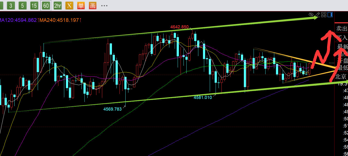 第一,黄金方面: 昨日亚盘三次试探4581支撑,原本它是通道下轨,理应可以尝试低位北上,但主要短时间内连续测试次数太多,不由得担忧它下破,击穿什么的,就一直看戏未动手,结果是踏空了;欧盘依托隔夜高点和早上低点的618分割阻力4619尝试看压制回测,跌至最低4583,并且此位置早埋伏北上,一波拉升触及4624高位,这两波先南后北,节奏还是可以的,利润空间也不错;夜间本计划4595回踩继续北上,但一直无法下行,就取消了,直到今日才给到;