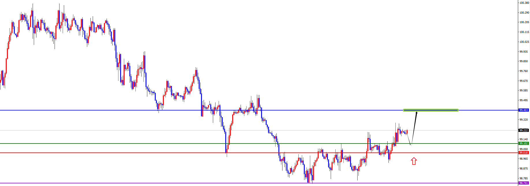 从多周期分析,周线级别来看近期价格在周线关键上下盘整,目前周线阻力于97.85区域,价格在此位置之下偏空对待,价格只有后续周线收盘在此位置上方才会转多。从日线级别看,随着时间的推移目前日线阻力于97.80区域,目前需要关注价格能否站稳日线及周线共振阻力是关键。从四小时上看,经过近期美指震荡承压看,短期价格更偏向于震荡,目前看重点关注97.25-98.10区间,四小时分数岭于早盘高点位置。一小时上目前价格更偏向于97.45-97.85区间震荡,所以目前重点关注小区间上下边缘得失。
