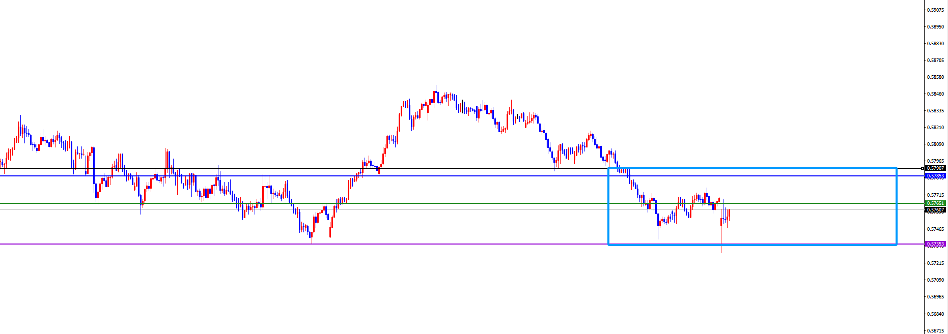 关键分水岭0.5765区域,目前月线阻力及周线支撑破位后跟随