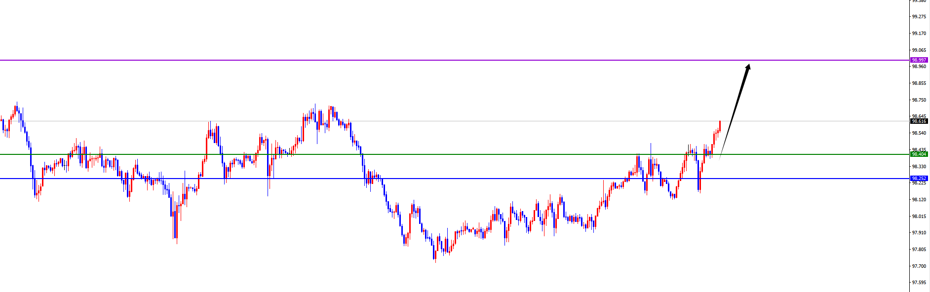 短线关键分水岭98.40-50区域,价格没有出现反转信号之前维持多